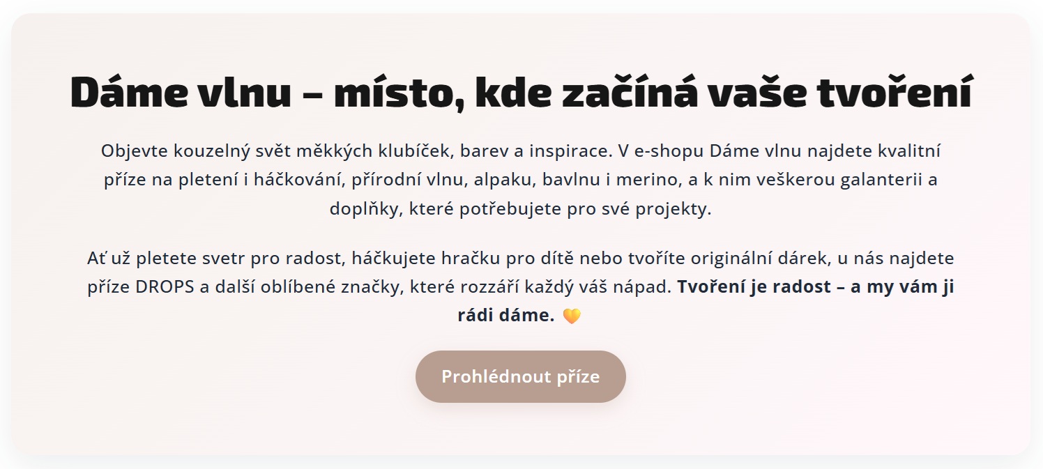Vytvořím pro vás profesionální textový blok s nadpisem, popisem a tlačítkem, který bude plně sladěný s vizuálním stylem vašeho e-shopu.