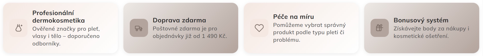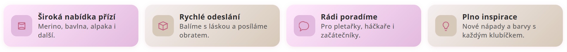 Vytvořím pro vás moderní, pastelově laděné a vizuálně čisté benefitové karty s ikonami, které elegantně vystihují vaše přednosti — například rychlé odeslání, profesionální poradenství, širokou nabídku nebo bonusový systém.
